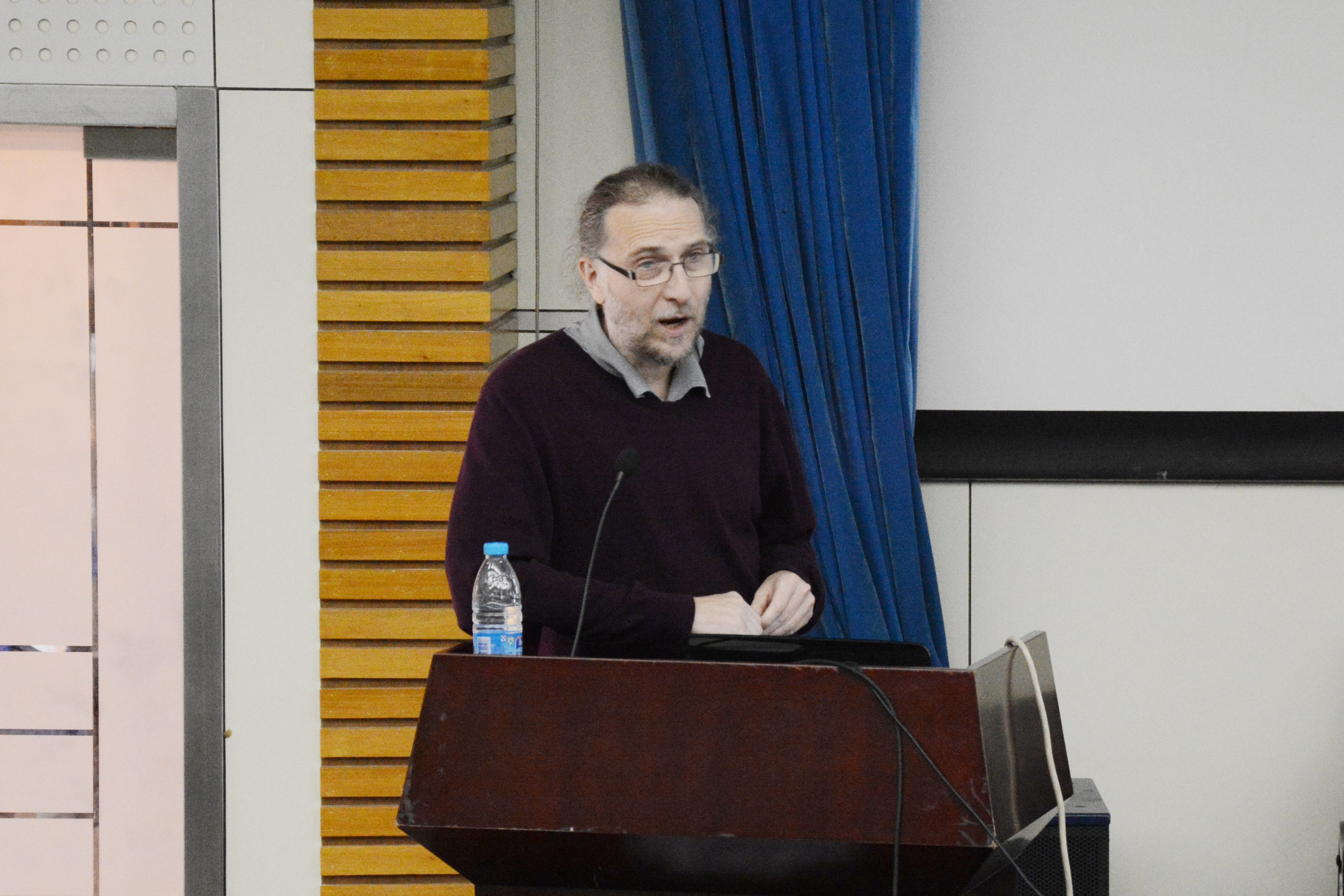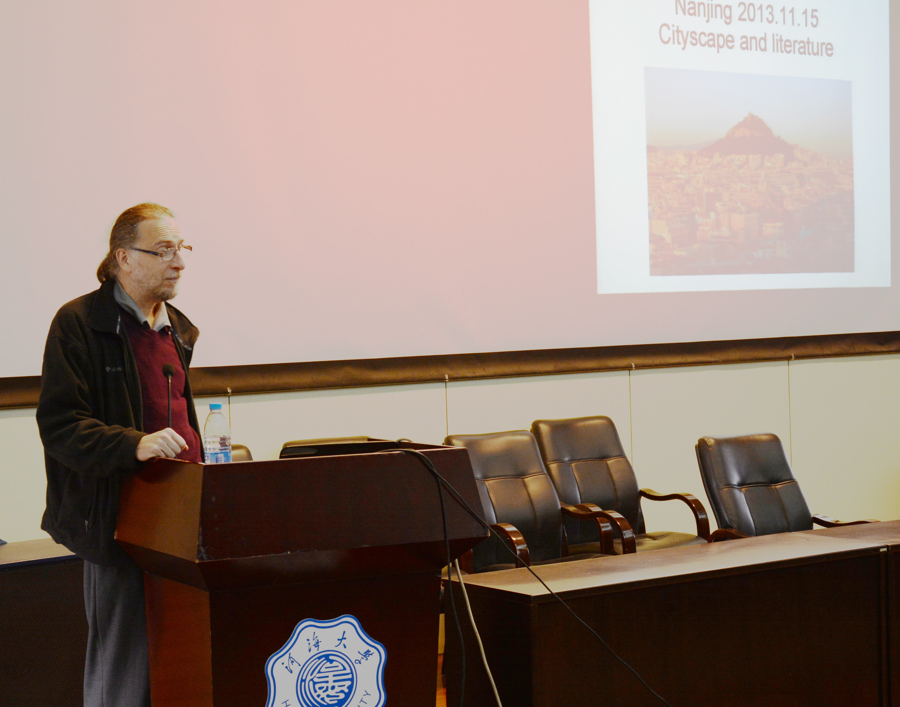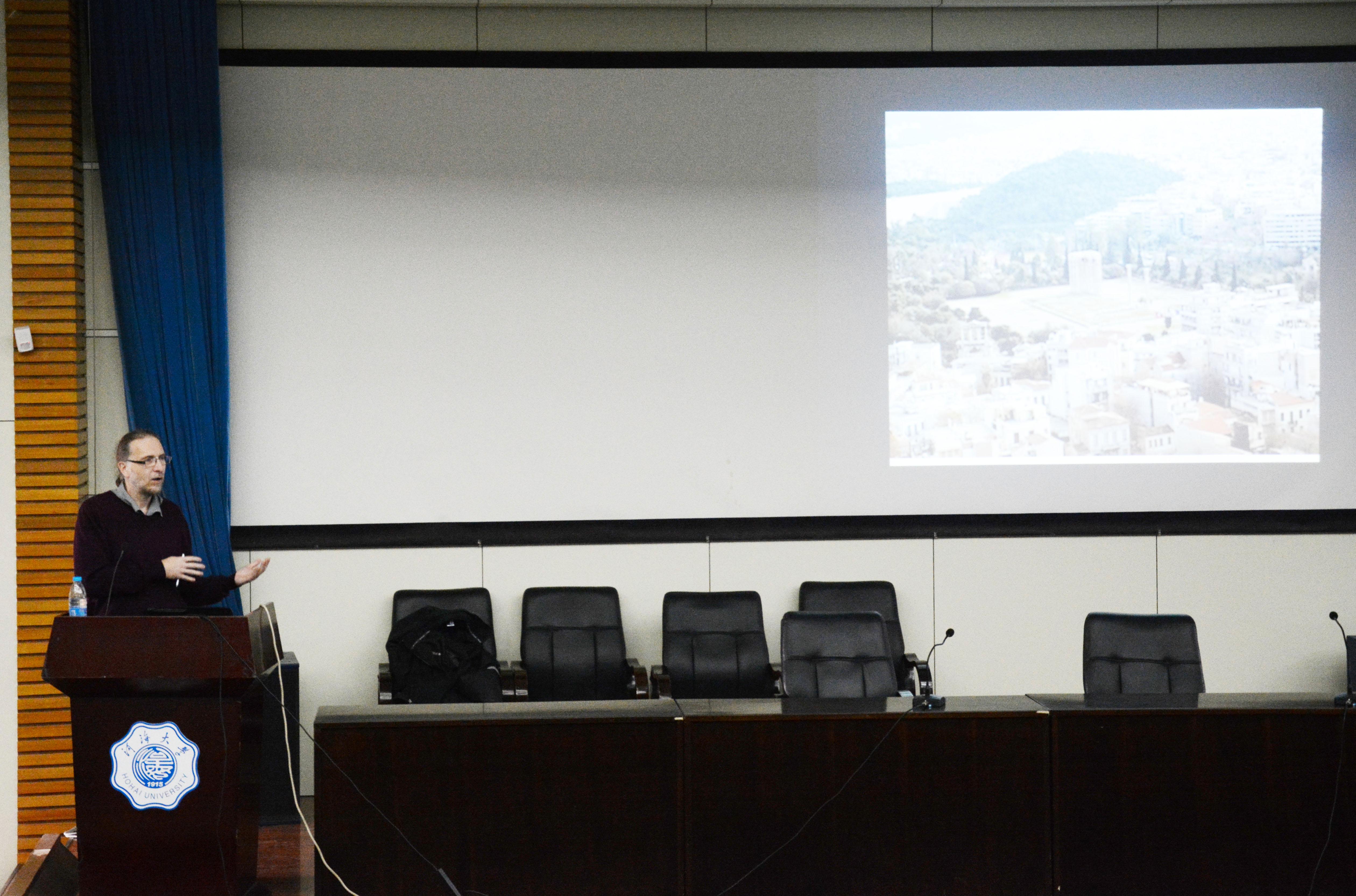 20131115日下午三点,应我院主持行政工作的副院长蔡斌教授邀请,SSCI期刊《世界比较文学》主编、匈牙利科学院人文学科研究中心Peter Hajdu教授在江宁会议中心为外国语学院全体师生做专题讲座“Cityscape and Literature”,学院副院长杜辉教授主持讲座。