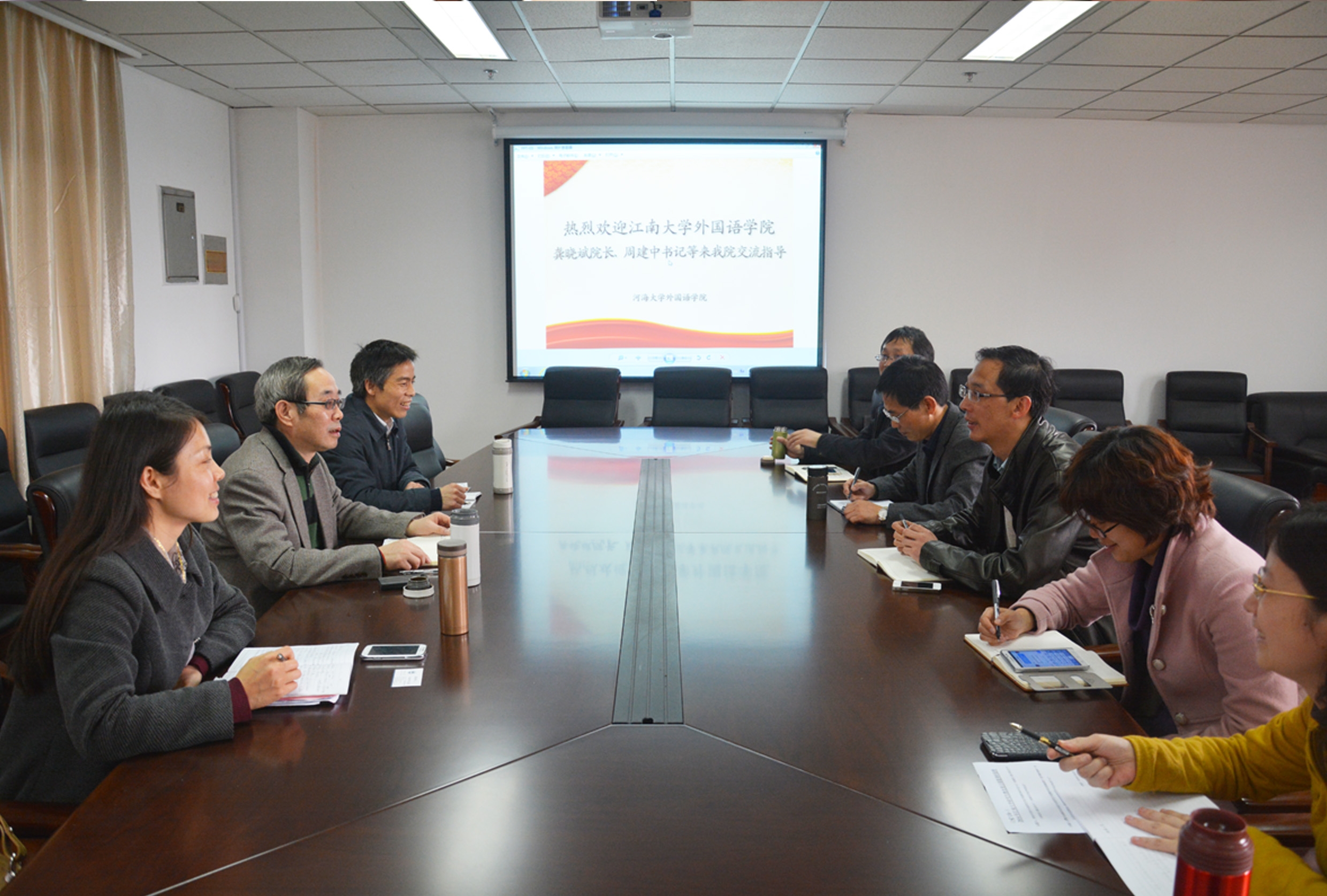 3月25日,江南大学外国语学院龚晓斌院长、周建中书记一行5人来我院交流访问。学院负责行政工作的蔡斌副院长、党委王炎灿书记、杨荣华副院长出席交流会。