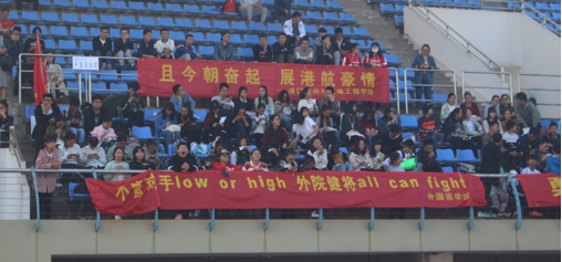 比赛开始,观众席上的外院学子手持蓝白加油棒为外院健儿加油鼓劲,加油声响彻操场,让人心潮澎湃!赛场内,我院运动健儿个个摩拳擦掌,毫不示弱。看台上,啦啦队的“不管对手low or high,外院健将all can fight”口号响彻云霄,不断给我们带来惊喜与感动。学院党委王炎灿书记、朱志梅副书记亲赴赛场慰问和关心学院运动员,辅导员蒋艺晴老师一直在赛场陪伴参赛选手,充分体现了学院和老师对本次运动会的高度重视和精心组织。王书记还角逐学校1000米的田径决赛,取得了良好的成绩。