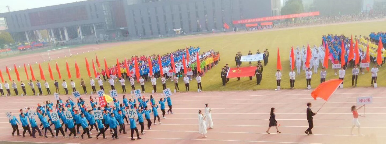 10月27日,河海大学第五十三届田径运动会暨第十九届老年人运动会在江宁校区体育场隆重举行,开幕式上外国语学院作为学院方阵的压轴队伍,给全校师生带来了极具国际化的入场展示。我院队列队员手持世界与中国的国旗以及写有“外院在我心中,世界在我脚下”的大字牌,表达了“同习外国语,共圆中国梦”的美好愿望,展现了外院人独有的风采。