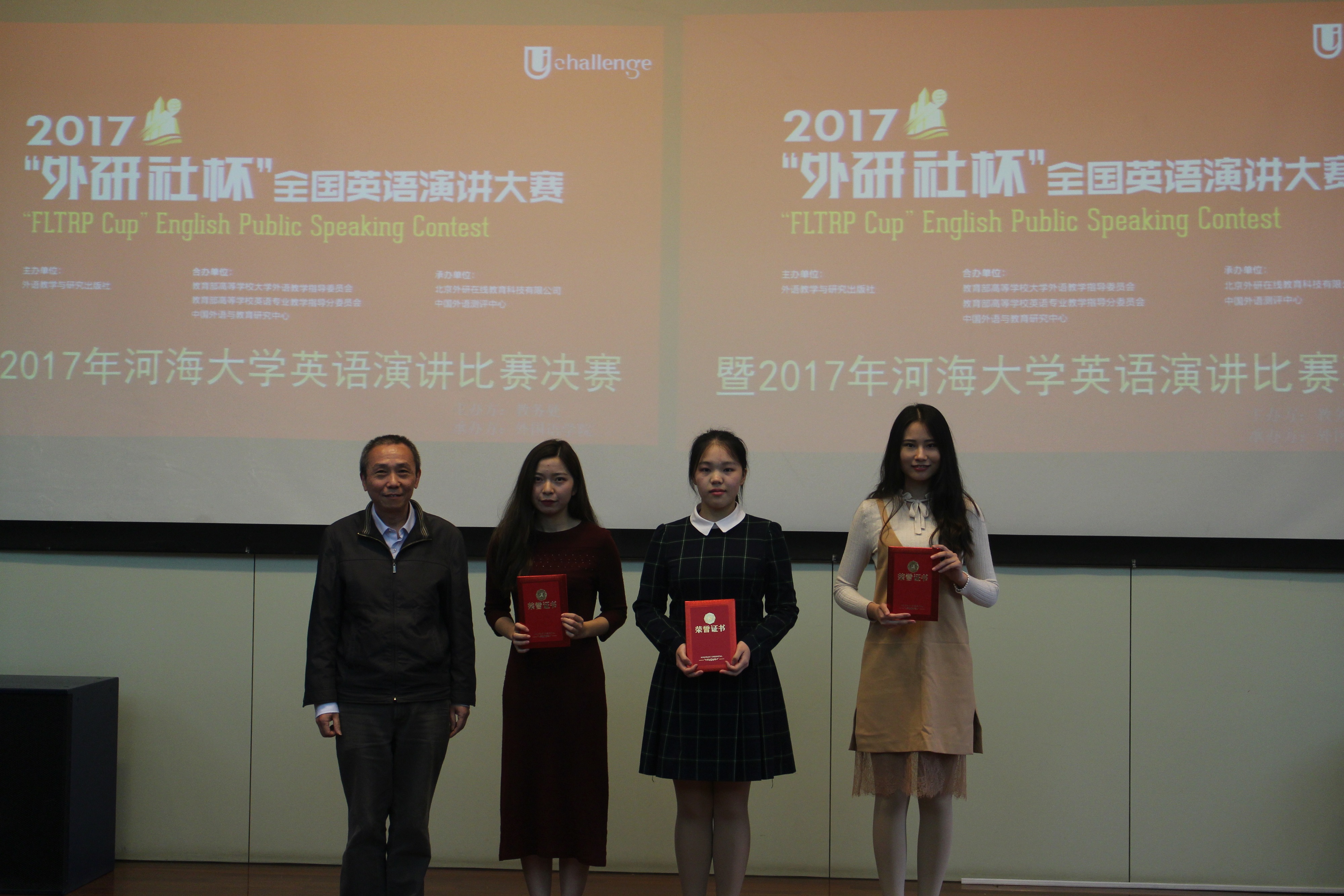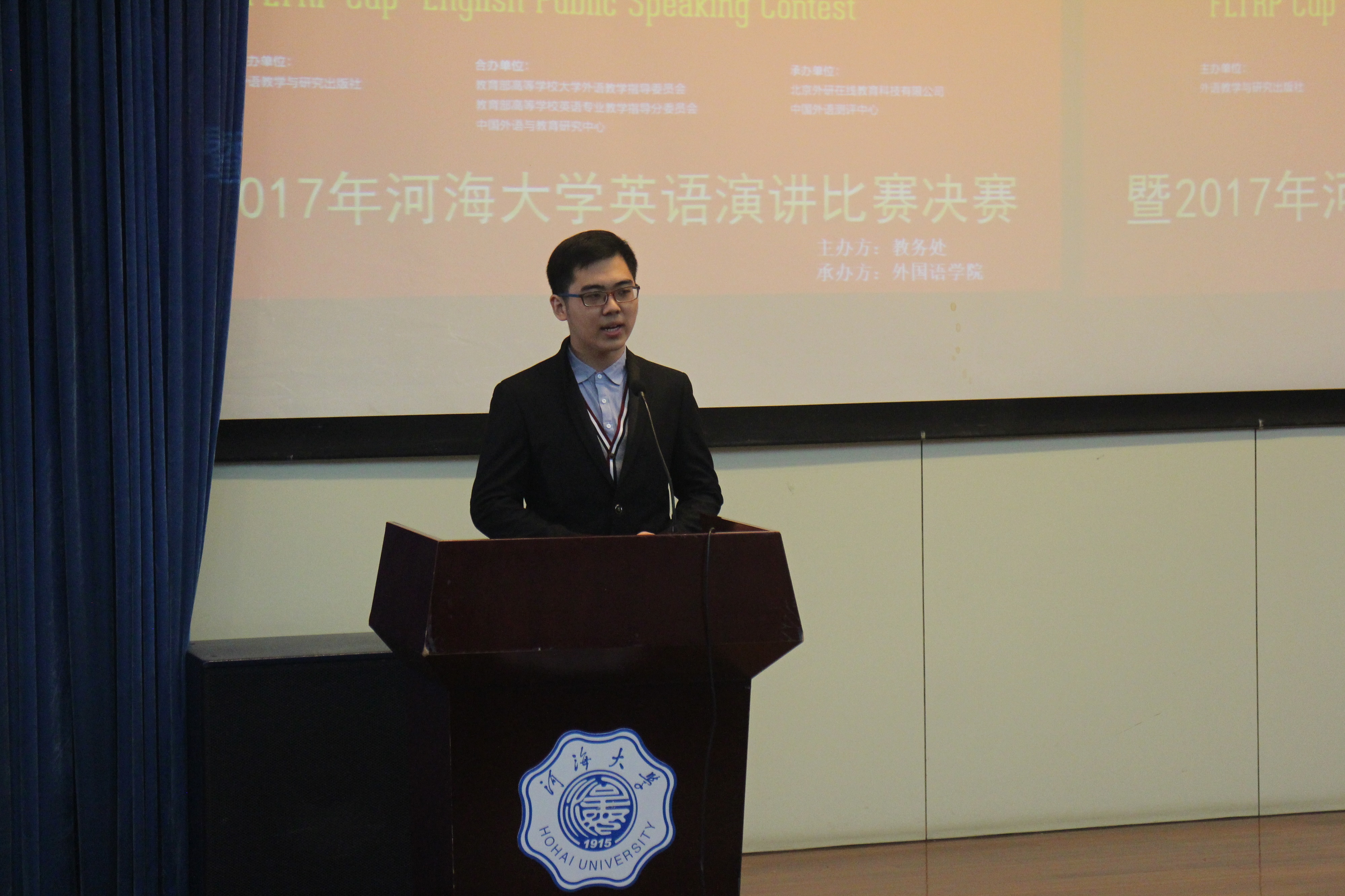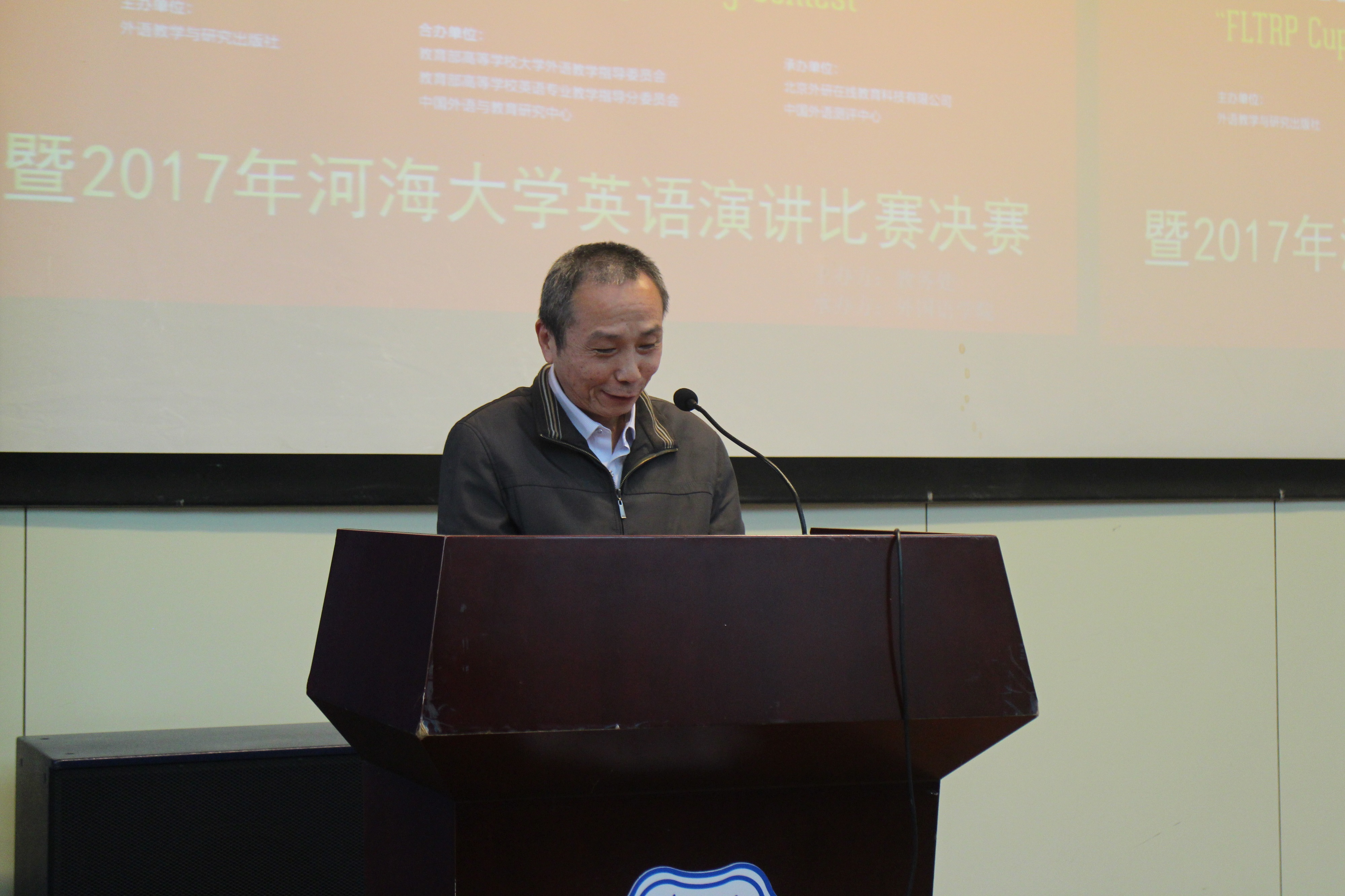 近日,我校成功举办2017年“外研社杯”全国英语演讲大赛河海大学选拔赛暨河海大学英语演讲比赛。此次大赛由河海大学教务处、外语教学与研究出版社主办,河海大学外国语学院承办,分初赛和决赛两个环节。河海大学教务处阮怀宁处长出席决赛颁奖仪式并致辞。