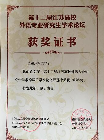 近日,第十二届江苏高校外语专业研究生论坛在南京航天航空大学外国语学院举行。来自南京大学、东南大学、南京师范大学等十九所高校的专家、学者以及研究生共计200余名代表参加了论坛。本次外语专业研究生学术论坛由江苏省高等学校外语教学研究会举办。我院共推选出7名研究生参加本次会议。其中2016级研究生孙鑫、潘亦欣、袁晓琳分别荣获一等奖、二等奖、优胜奖,展现了我省高校外语专业研究生良好的学术风貌和学术素养。