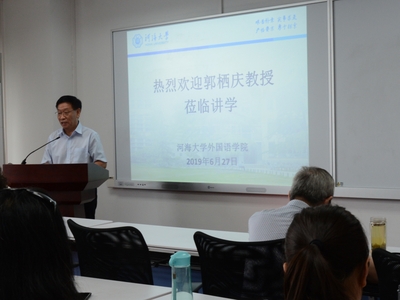 6月27日,北京外国语大学郭栖庆教授应蔡斌院长邀请莅临我院作学术报告,报告主题为:对目前外国文学研究中存在的几个问题的思考。本次报告由我院副院长张海榕教授主持。