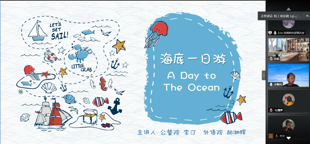 8月20日,以“海底一日游——碧水蓝天,你我共建”为主题的线上双语科普课堂再次举办。志愿者以“小海龟找妈妈”为教学背景,从海洋地貌、海洋生物、海洋资源、海洋保护海洋工程五个方面展开教学内容,带领孩子们走进缤纷多彩的海洋世界,树立保护海洋的意识。