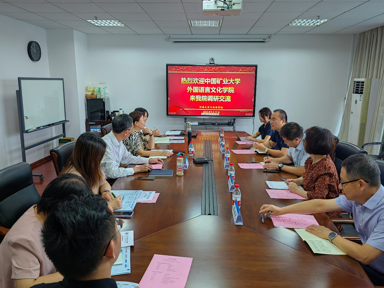 9月12日,中国矿业大学外国语言文化学院党委书记张向东、副院长祖大庆、副院长刘婷婷等一行来我院调研和交流。学院领导班子和院办人员参加会议。双方就英语专业人才培养特色、专业发展、学科建设、大学英语教学等方面深入交流。会议由院长张海榕教授主持。