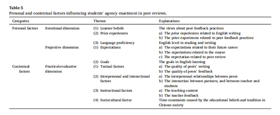 该研究揭示了学生在二语写作的同伴反馈中,受到来自多项个人因素和情境因素的交互影响,其中课程主讲教师的课堂教学是最为显著的正向影响因素。研究还揭示了学生反馈能动性在能动性生态框架“迭代”、“实践-评估”和“目标”维度中的独特表现,为构筑提升学生能动性的二语写作课堂提供了教学启示。