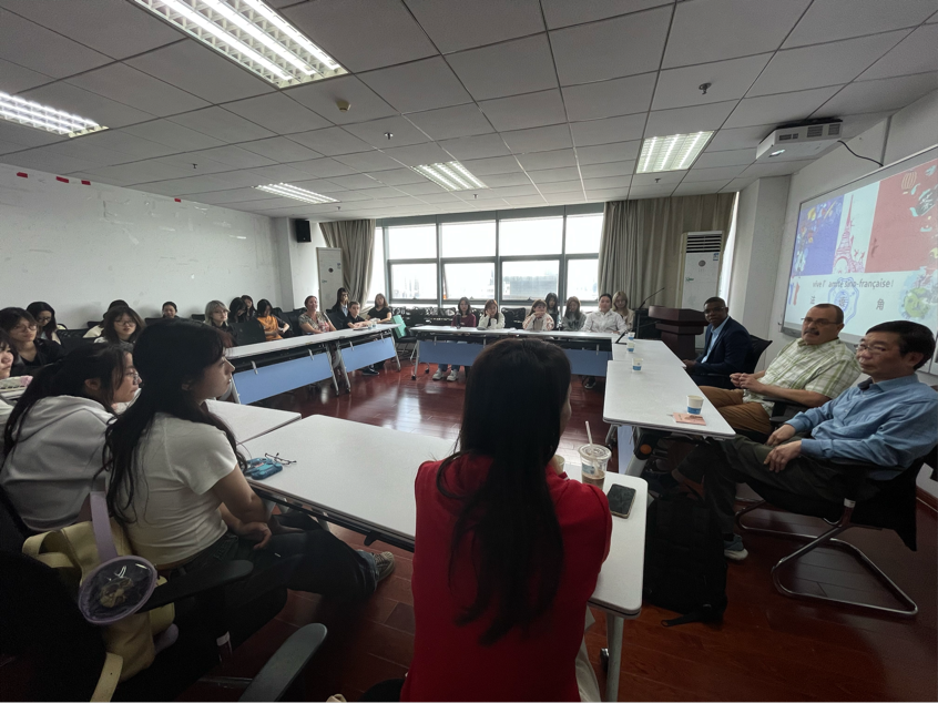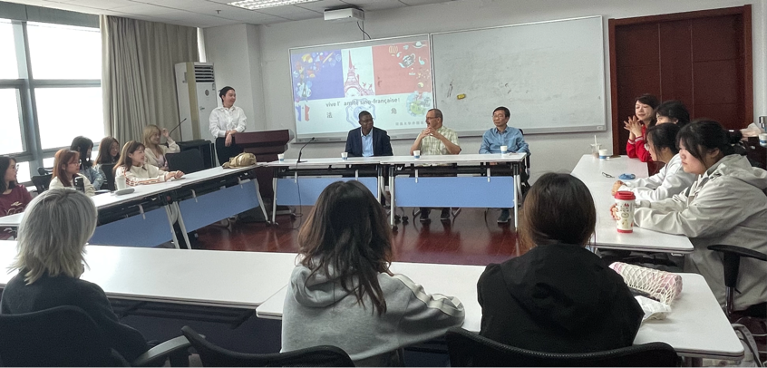 今年是中法建交60周年。4月24日,法国阿尔萨斯孔子学院Michel CHÉRAY主席、陈跃院长一行来我院访问交流,共同开展“Vive L’amitié Sino-Française”(中法友谊万岁)主题活动,外国语学院院长张海榕教授、法语系教师及学生参加活动。
