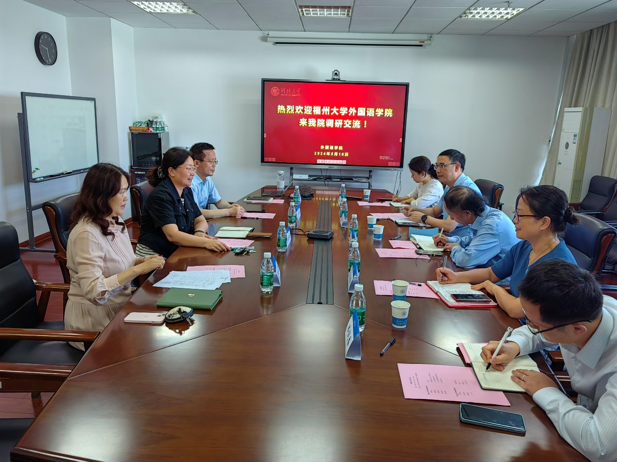 5月16日,福州大学外国语学院钟晓文院长一行来我院调研交流。学院领导班子和院办人员参加会议,双方就教育教学改革、科研团队建设等话题展开调研。